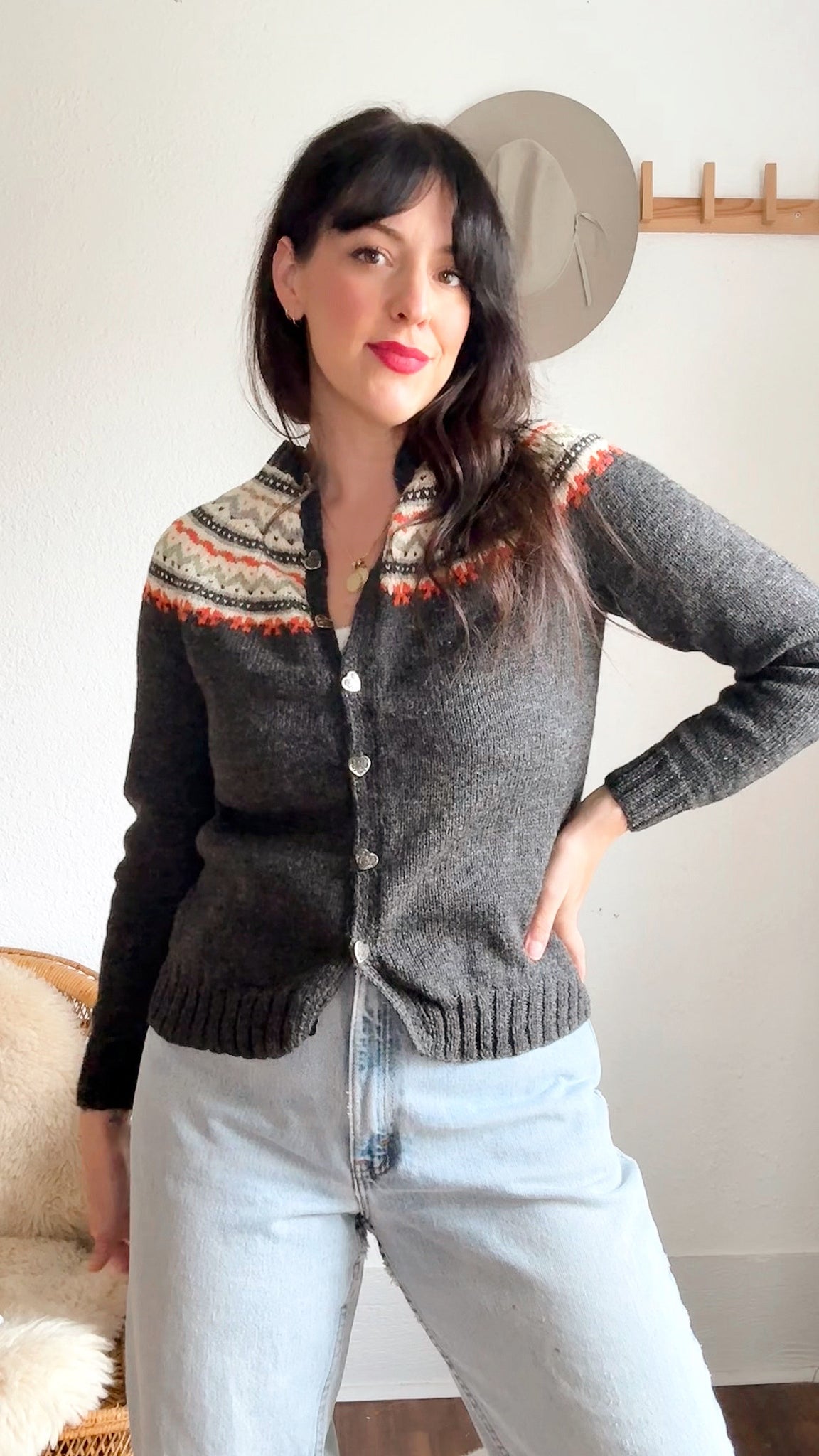 Info: This original fair isle cardigan is so cute and has the coolest buttons! this cardigan is in good condition, small mark near the top pictured in photos.